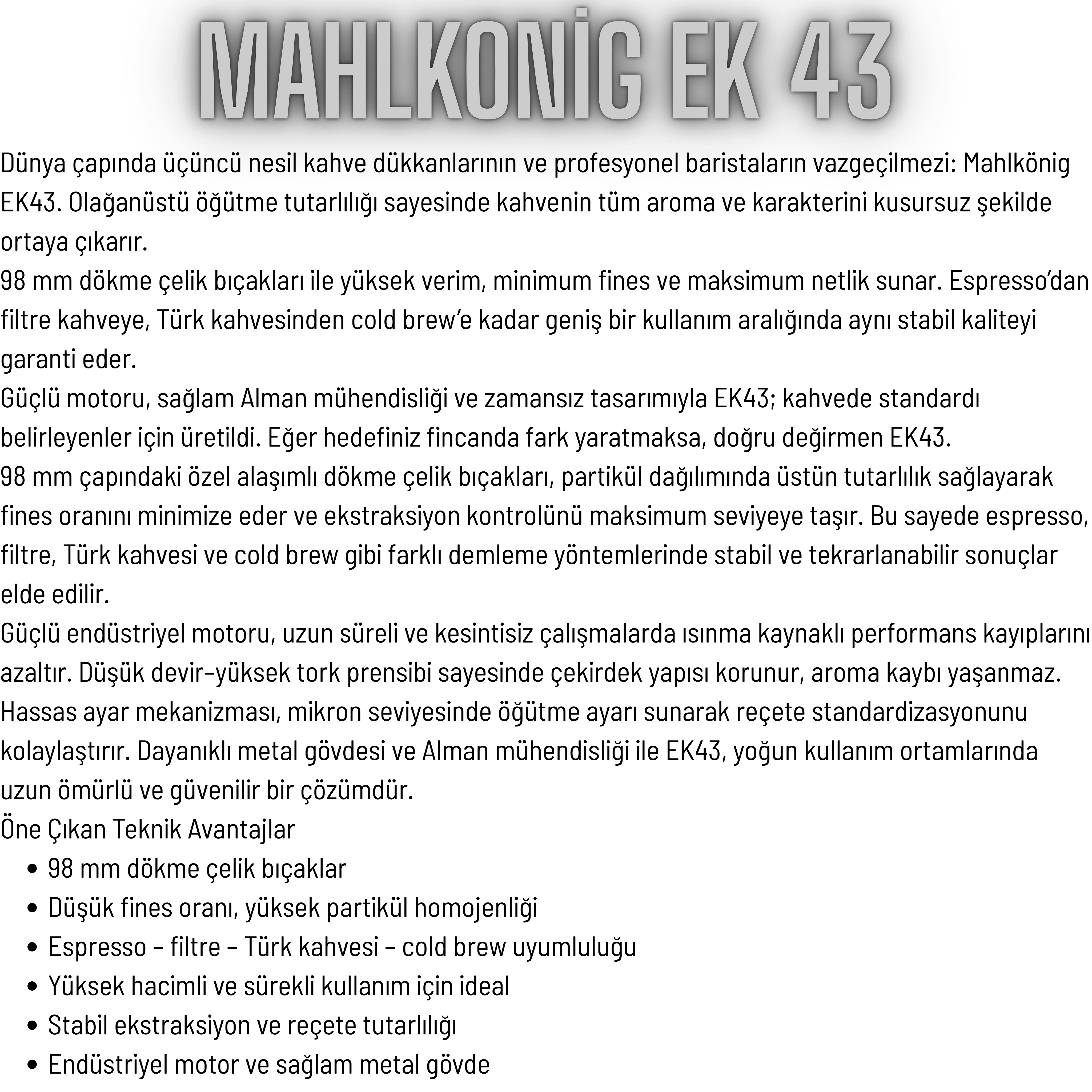 Mahlkönig kahve değirmenlerinin sağlamlığı; metal gövde yapısı, güçlü motoru ve yüksek hassasiyetli öğütme mekanizmasıyla kendini net şekilde belli eder. Dayanıklı dış yapısı, darbelere ve yoğun kullanıma karşı direnç göstererek performansın uzun süre korunmasını sağlar.Bu sağlam yapı yalnızca dayanıklılık sunmakla kalmaz, aynı zamanda düzenli ve homojen öğütme imkânı tanır. Homojen öğütme sayesinde kahve çekirdeklerinin aroma ve tat profili en üst seviyede korunur. Bu da özellikle espresso ve filtre kahve gibi demleme yöntemlerinde daha dengeli, berrak ve kaliteli fincan sonuçları elde edilmesini sağlar.