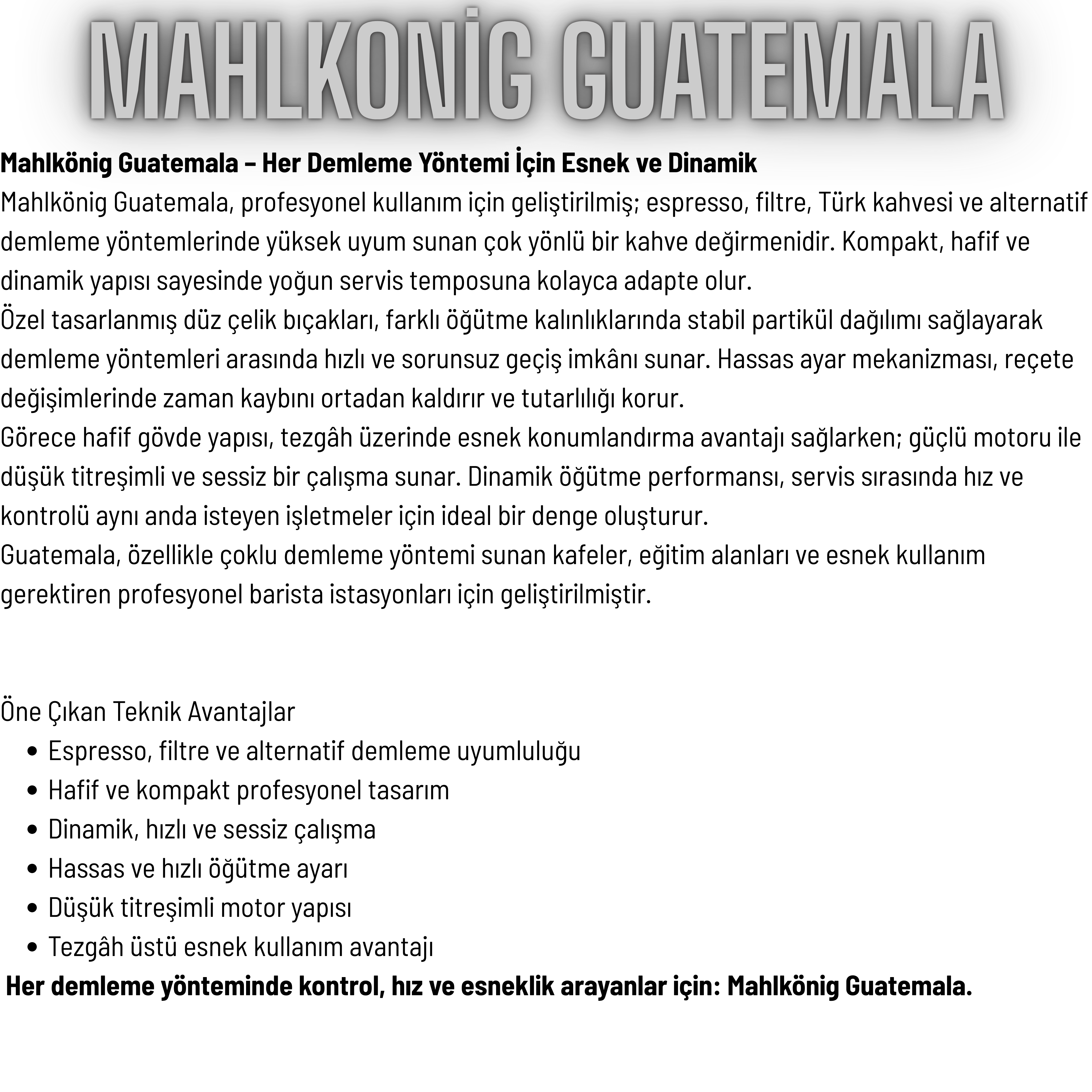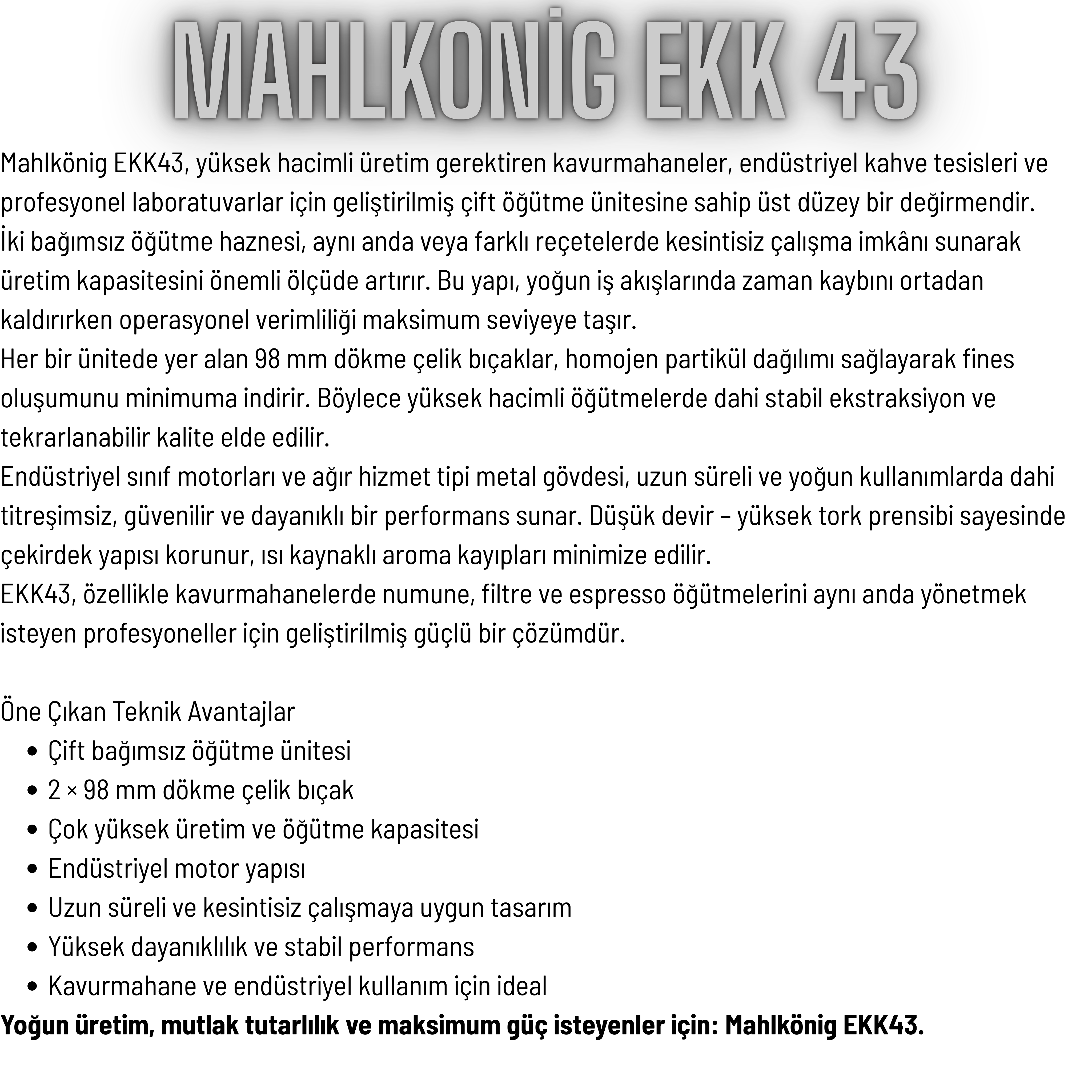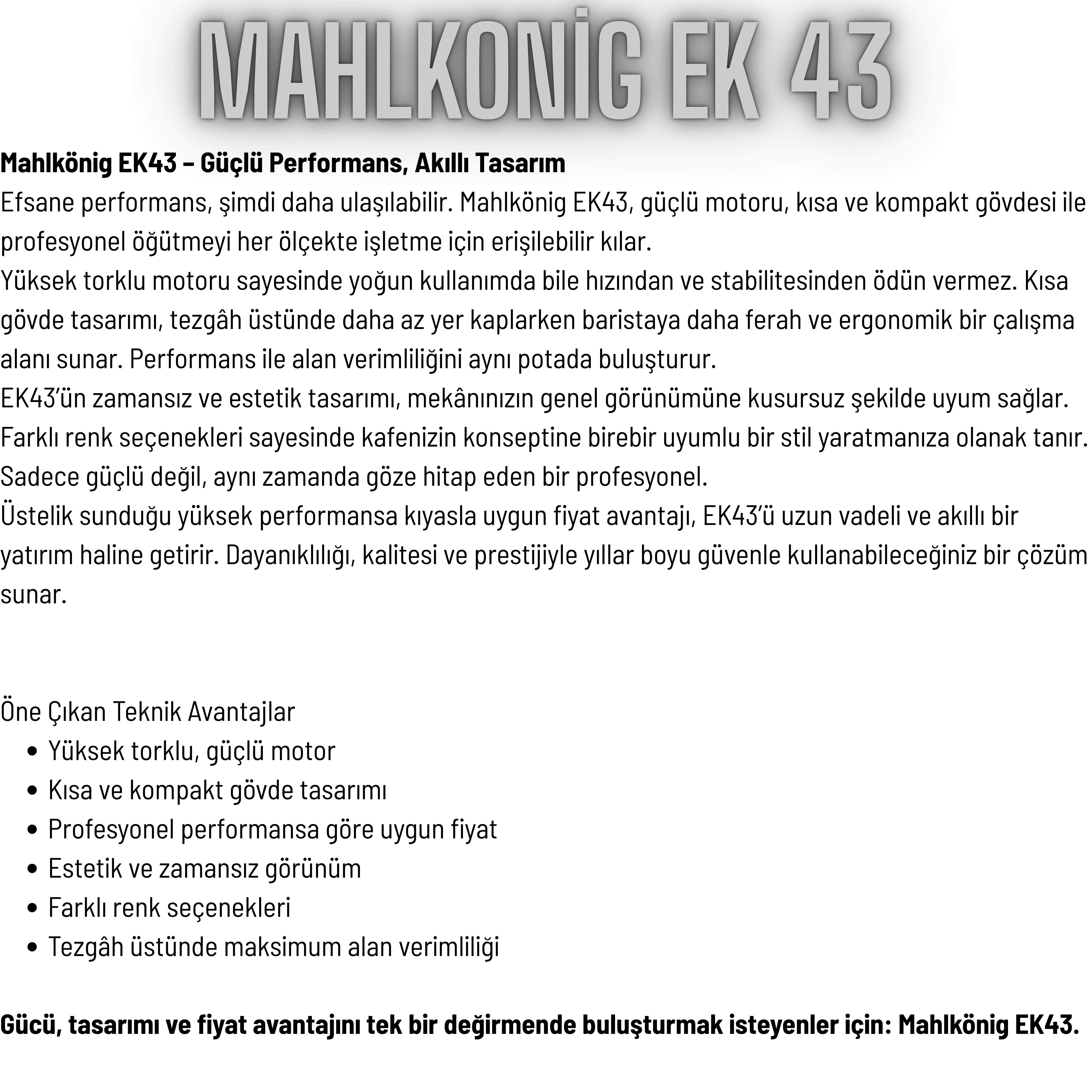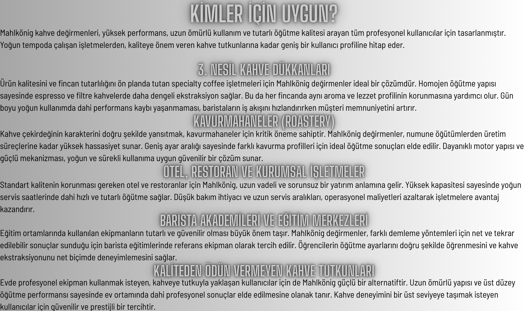 Mahlkönig kahve değirmenleri, kahve severlerin ve profesyonellerin tercihleri arasında yer almasının temel sebepleriyle sektörün en güvenilir markalarından biridir. Sağlam yapısı, sunduğu yüksek performans ve fiyat-performans dengesi sayesinde hem yoğun kullanıma sahip işletmeler hem de kalite odaklı kullanıcılar için ideal bir çözüm sunar.Yüksek kaliteli malzemeler kullanılarak üretilen Mahlkönig değirmenler, uzun yıllar boyunca sorunsuz şekilde çalışabilecek dayanıklılığa sahiptir. Bu özellik, özellikle kahve dükkanları, kavurmahaneler ve profesyonel işletmeler için büyük bir avantaj sağlar. Uzun ömürlü ve güvenilir ekipmanlara yatırım yapmak, işletme maliyetlerini düşürürken iş akışının kesintisiz devam etmesine katkı sağlar.