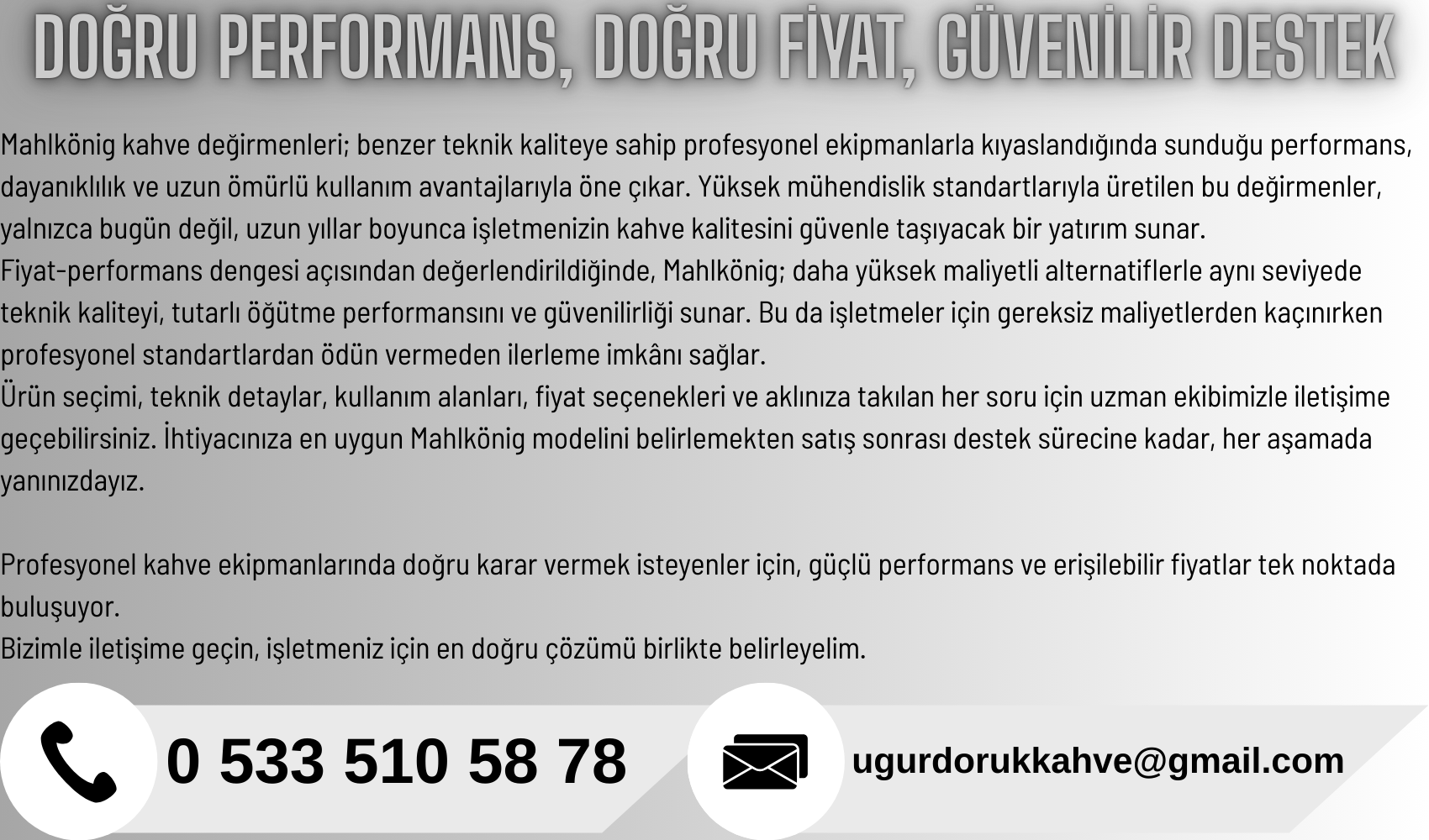 Fiyat açısından değerlendirildiğinde, Mahlkönig kahve değirmenleri piyasadaki diğer profesyonel değirmenlerle kıyaslandığında oldukça rekabetçi bir konumda yer alır. Daha pahalı alternatiflerle aynı kaliteyi ve dayanıklılığı sunması, Mahlkönig’i fiyat-performans açısından güçlü bir seçenek haline getirir.Uzun vadeli kullanım avantajı, düşük arıza oranı ve sağlam yapısı sayesinde bu ürünler, fiyatının karşılığını fazlasıyla verir. Ayrıca servis ve yedek parça temini konusunda geniş destek seçeneklerine sahip olması, kullanıcılar için ek bir güven unsuru oluşturur.